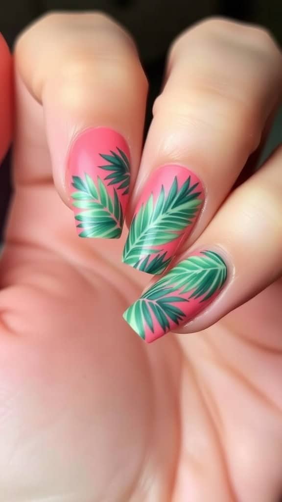 Get ready to embrace fun with tropical nail designs! Palm leaves bring a fresh and lively touch to your spring look. These nails can easily add a pop of color and nature-inspired flair to any outfit.