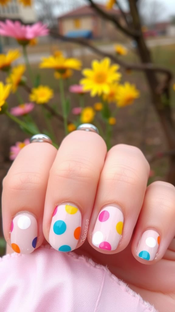 Polka dots never go out of style, and this fun twist makes them even more delightful for spring! Mixing bright colors like pink, orange, and blue on a soft background creates a cheerful vibe. This playful design is perfect for anyone looking to add a pop of fun to their nails this season.
