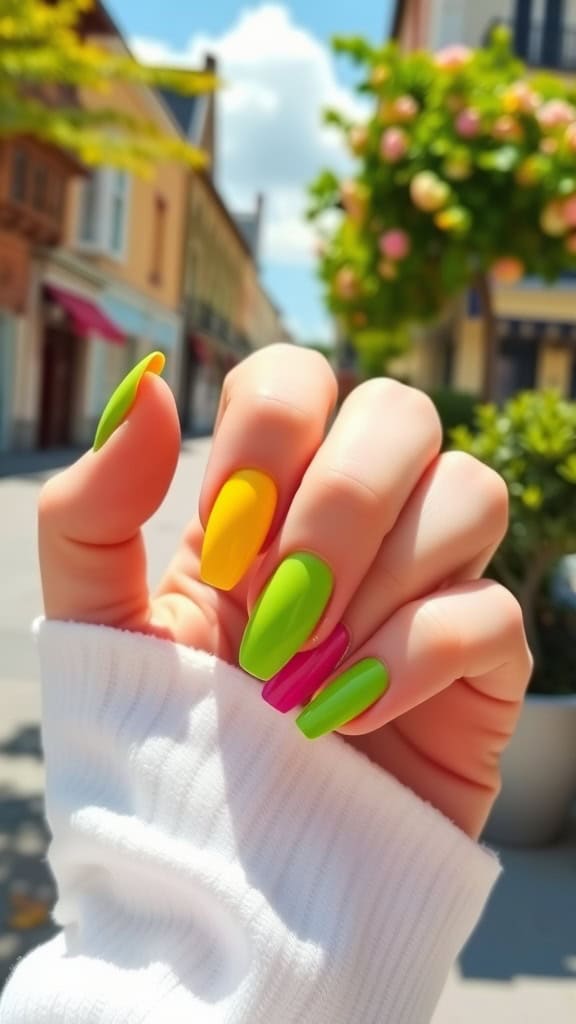 Bright color block nails are a fun way to welcome spring! Use bold shades like green, yellow, and pink for a vibrant look that stands out. This style is perfect for those who want to express their personality through their nails.