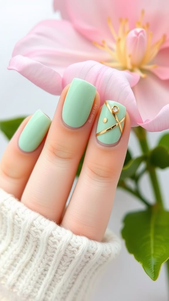 Mint green nails with gold accents are a perfect choice for spring. The fresh color feels light and cheerful, while the gold adds a touch of glam. This combo is easy to wear and works well for any occasion, from casual outings to special events.